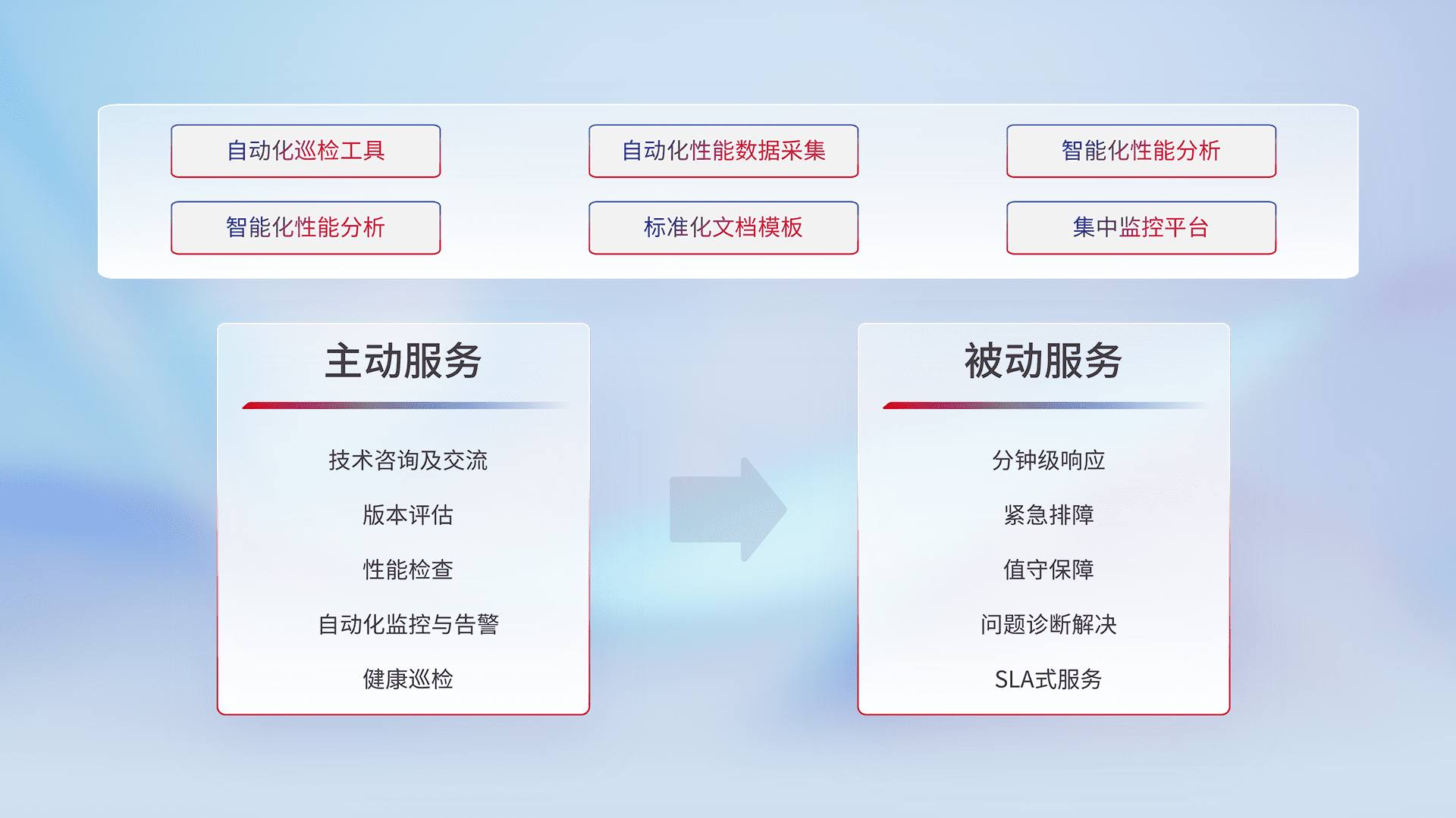 智能化工具和标准化文档,,,,保障服务质量,,,,提供主动服务(包含技术咨询、、版本评估、、、、性能检查、、自动化监控与告警、、健康巡检)和被动服务包含(分钟级响应、、紧急排障、、、、值守保障、、问题诊断解决、、、SLA服务)。。。。