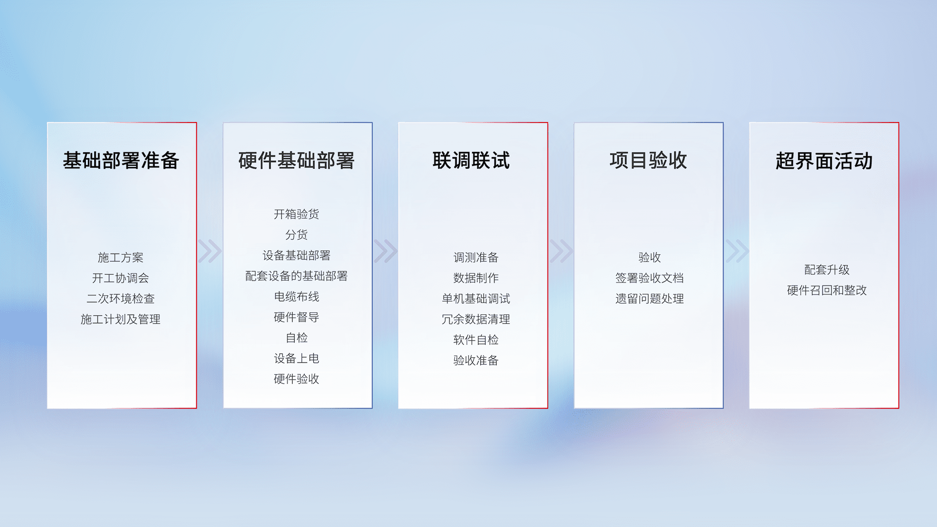 从基础部署准备、、硬件基础部署、、联调联试、、、项目验收、、、越界面活动的全过程可追溯,,,,保证施工质量和进度。。。